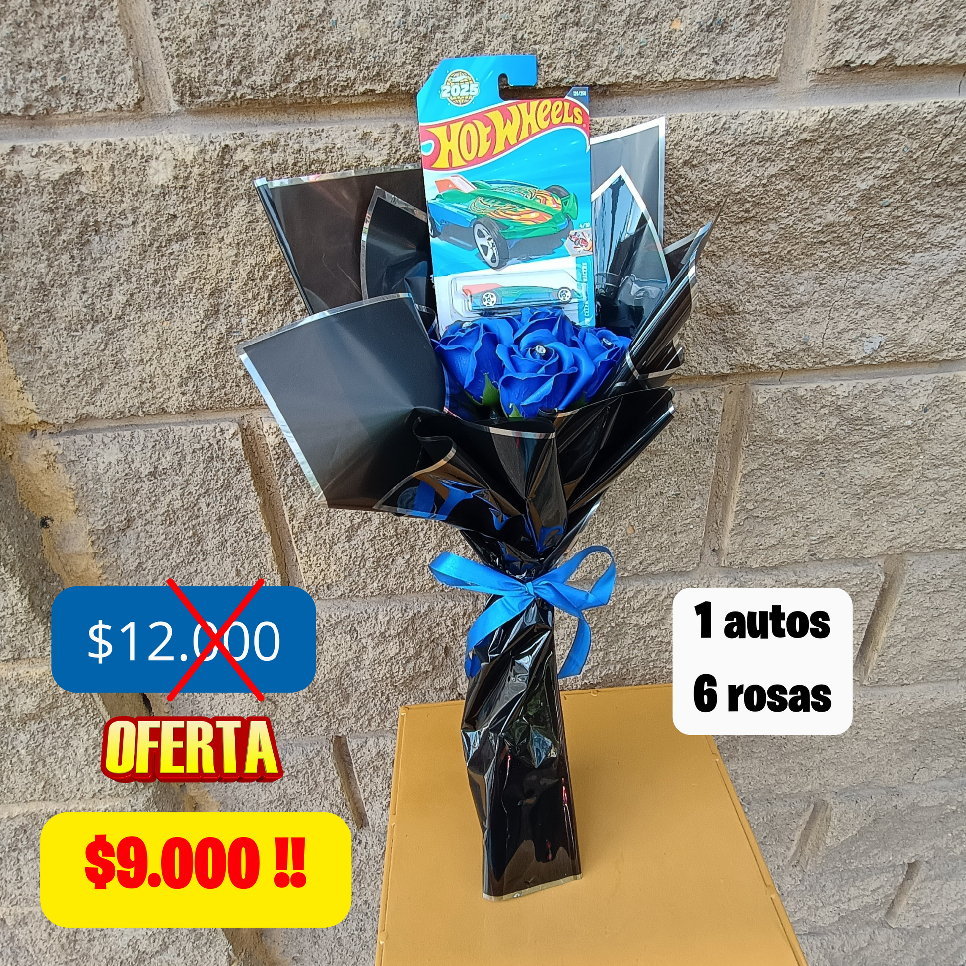 Ramo hotweels con 6 rosas eternas envueltas en papel koreano, cinta y tarjeta de mensaje